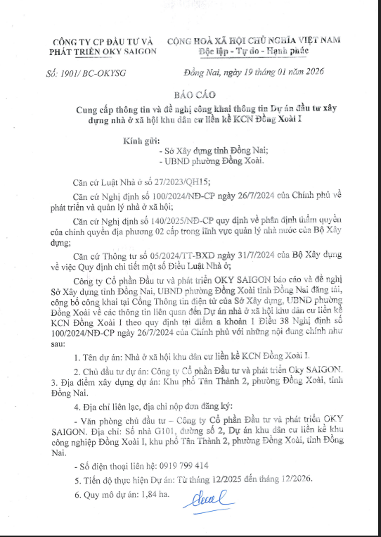 Công ty Cổ phần Đầu tư và Phát triển OKY SAIGON vừa có báo cáo, cung cấp thông tin về Dự án đầu tư xây dựng nhà ở xã hội khu dân cư liền kề Khu công nghiệp Đồng Xoài I theo quy định của pháp luật về nhà ở xã hội.
