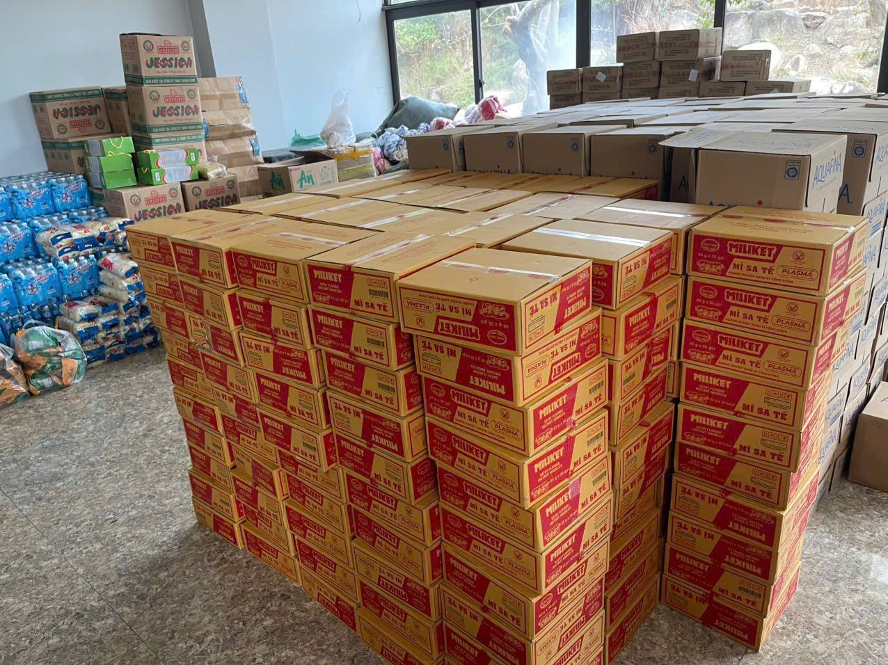 Những thùng mì được tập kết để trao cho bà con vùng lũ lụt